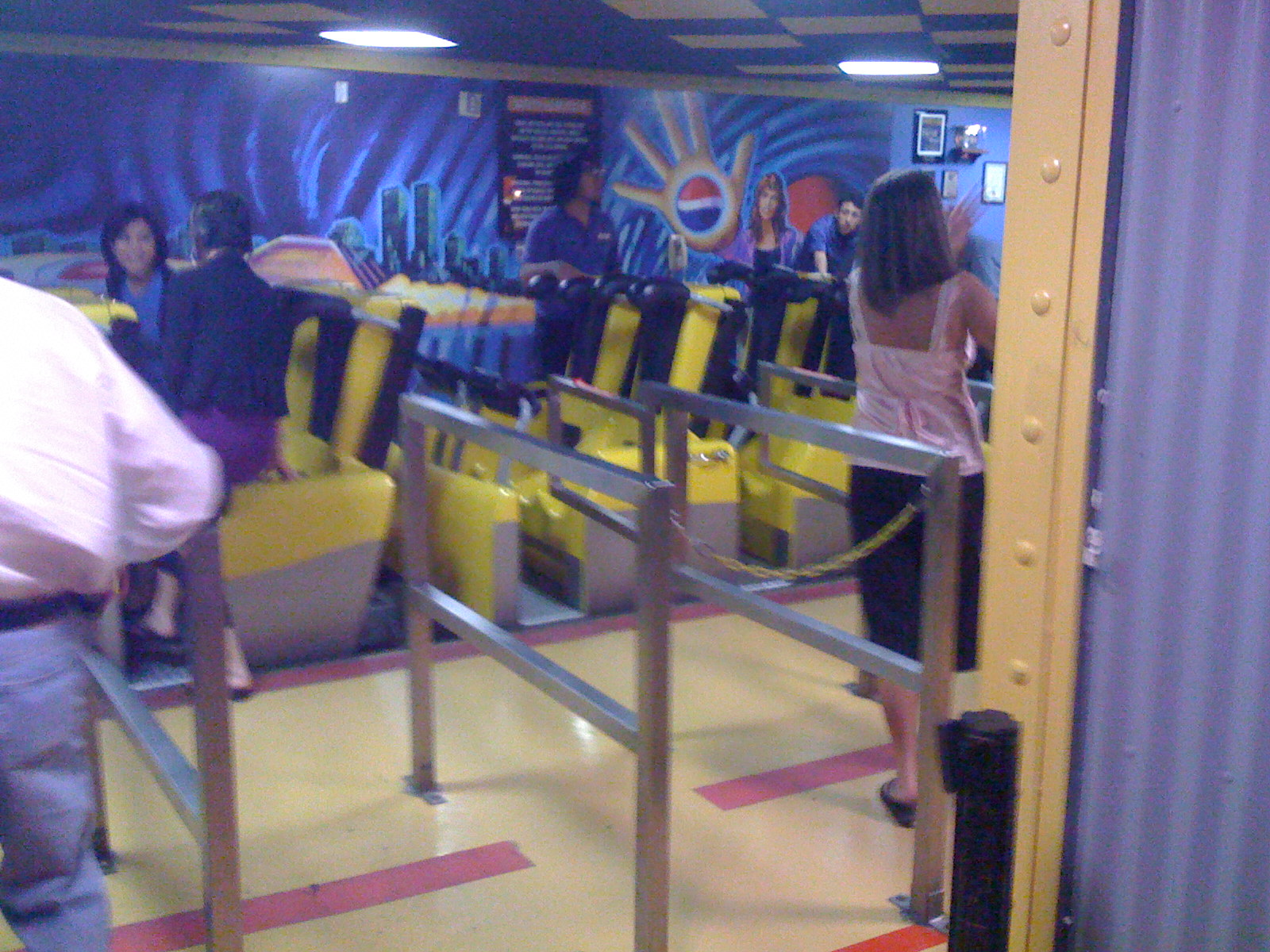 Station, trains, two-piece restraints, operators, and patrons.